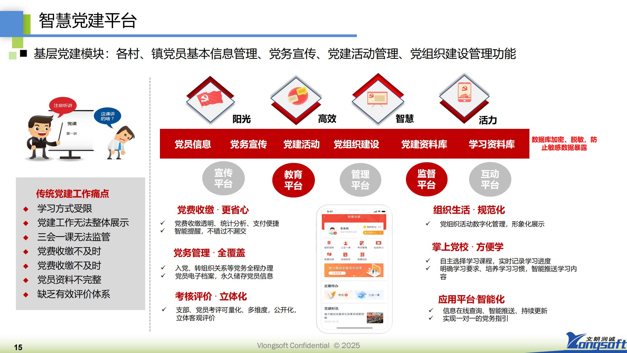 智慧党建平台是依托互联网、大数据、云计算等技术,整合党建工作全流程、服务党员全周期的“数字化党建中枢”,打破传统党建在时间、空间上的限制,实现党建工作从“线下为主”向“线上线下融合”升级,为党组织管理、党员学习与服务群众提供高效支撑。主要功能有:党员信息、党务宣传、党建活动、党组织建设、党建资料库、学习资料库等功能组成。